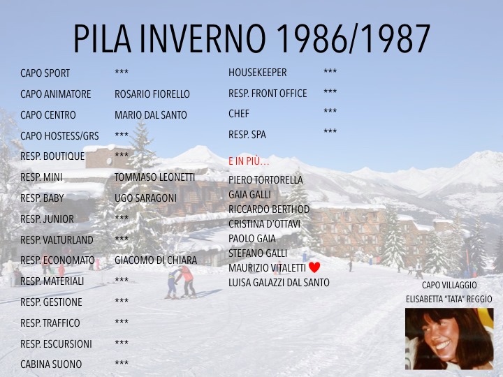 Sicuramente ci sono stagioni travagliate, stagioni che ricordi per particolari eventi, stagioni anonime o più semplicemente stagioni in cui alcune cose si ripetono in forma ripetitiva o meglio, alcuni eventi colpiscono meno la fantasia o la mente di chi scrive e meno ancora di chi legge. Pila 86/87 fu un inverno in cui non successe nulla di particolare! No, forse non è nemmeno quello, credo sia stata una stagione in cui fu tutto talmente eccezionale e sopra i normali standard che alla fine ci si è abituati fin da subito ad una felicità globale che poteva essere alla fine considerata normale, quindi una stagione tranquilla poiché quello che era la routine quotidiana era già eccezionale, Fiorello capo animazione, fidanzato ufficialmente con Elisabetta Reggio il primo capo-villaggio donna che tutti da sempre siamo stati abituati a chiamare Tata. Ricordo una frase di Rosario anni prima , forse durante uno dei pochi omenti di relax in cui ci si apriva un po di più “Oh ragazzi ma vi immaginate se riesco fidanzarmi con Tata? troppo bella!” Tata oggi è ancora una bellissima donna e all’epoca era una stupenda ragazza si trova a a capo di un’ azienda che commercializza integratori per la salute e prodotti cosiddetti ringiovanenti, mai direttore fu miglior testimonial del prodotto venduto…. L’equipe \