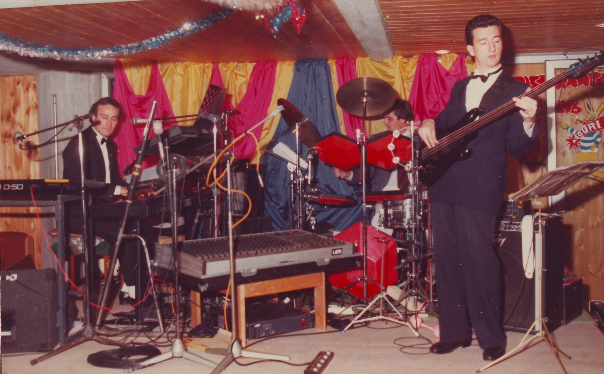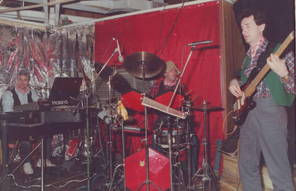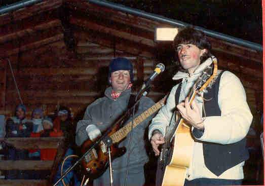 In questa foto siamo io e il bassista Massimo Apicella mentre stiamo suonando alla fiaccolata di capodanno di fronte agli impianti di risalita e le baite ristorante, naturalmente all’aperto, immaginiamo solo la temperatura e le nostre mani a livello congelamento polare. A Pila in quella stagione eravamo un gruppo di musicisti che andavano oltre i fantastici Cactus, c’era anche Onofrio Mattina, con cui ci alternavamo in taverna.